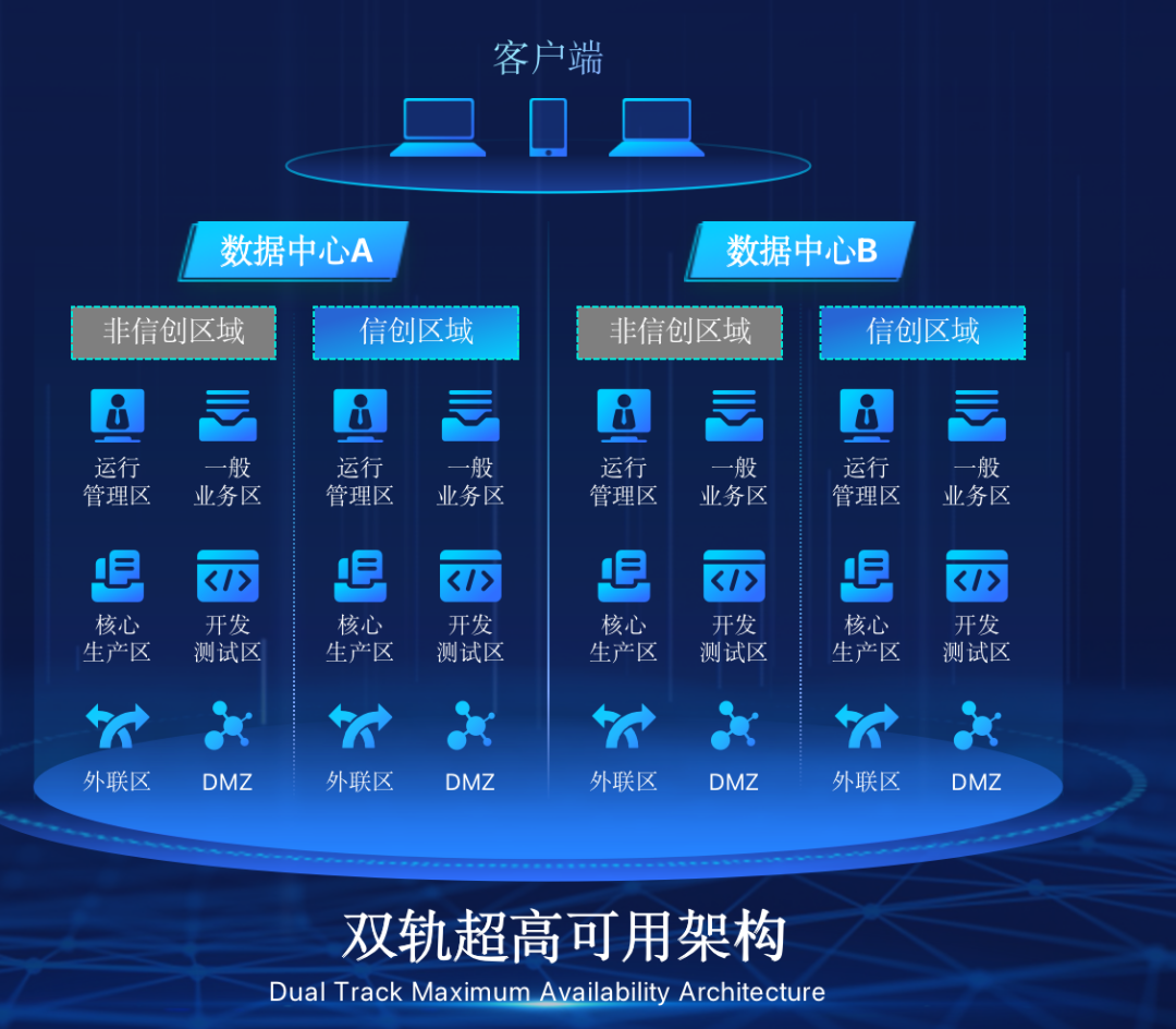 bbin宝盈集团官网在企业面临自主创新IT基础重构过程中,推出的全新架构双轨超高可用架构(简称DTMAA),在双活数据中心的分区调度基础上,添加每个数据中心内信创域和非信创域的分域调度,来实现分区分域协同的多活双轨超高可用。